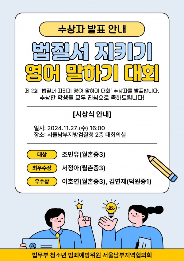 제 2회 '법질서 지키기' 영어 말하기 대회 시상식 안내 페이지 정보 작성자 서울남부지역협의회 작성일24-10-28 13:22 조회282회 댓글0건 관련링크 이전글 다음글 목록 본문 수상하신 학생 여러분 진심으로 축하드립니다. < 시상식 안내 >- 일 시 : 2024. 11. 27.(수) 16:00 (15:20까지 필히 도착요망)- 장 소 : 서울남부지방검찰청 2층 대회의실 * 수상자는 전원 2024. 11. 27. 16:00 (리허설 예정으로 15:20까지 필히 도착 요망) 시상식에 참석해주시기 바라며, 불참시 꼭 연락주시기 바랍니다. 댓글목록 등록된 댓글이 없습니다. 이전글 다음글 목록