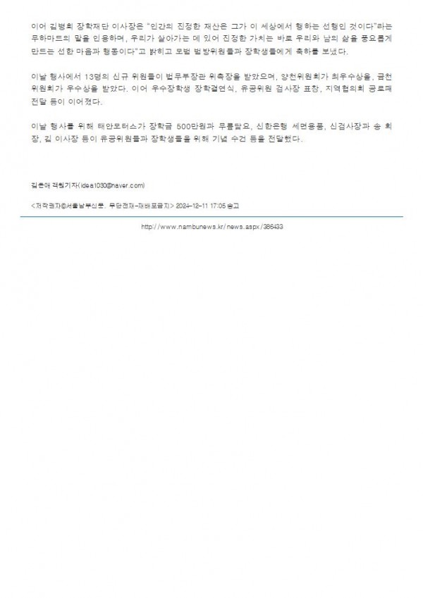 [신문기사] 2024년 한마음대회 및 장학생결연식 가져(서울남부신문_2024.12.11) 페이지 정보 작성자 서울남부지역협의회 작성일24-12-12 09:38 조회238회 댓글0건 관련링크 다음글 목록 본문 링크 : http://www.nambunews.kr/coding/news.aspx/16/1/386433 댓글목록 등록된 댓글이 없습니다. 다음글 목록